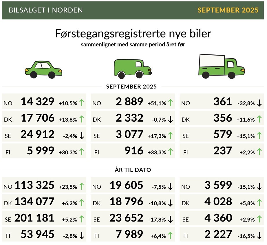 Sammenlignet med fjoråret, økte det nordiske salget av førstegangsregistrerte nye personbiler i september med over 30 prosent i Finland, snaut 14 prosent i Danmark og over 10 prosent i Norge. I Sverige falt det med drøyt to prosent.