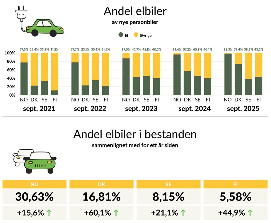 September ga Norge enda en gang «all time high», med en elbilandel på 98,3 prosent av alle førstegangsregistrerte nye personbiler. Etter årets første ni måneder ligger den norske elbilandelen nå på 95 prosent.