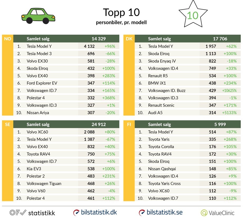 Norske data: OFV.no , Danske data: Bilstatistik.dk, Svenske data: Bilstatistik.se, Finske data: valueclinic.fi: Transport- og kommunikasjonsmyndigheten Traficom, Trafikk- og transportregisteret.