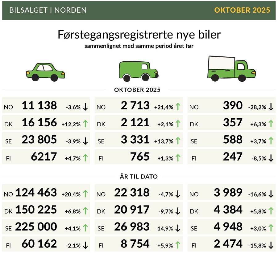 I Norge ble det registrert 11 138 nye personbiler i oktober – 3,6 prosent færre enn samme måned i fjor. Etter ti måneder er nybilsalget opp 20,4 prosent, med 124 463 biler registrert hittil i år. Elbilandelen i nybilsalget holder seg i oktober på 97,4 prosent.