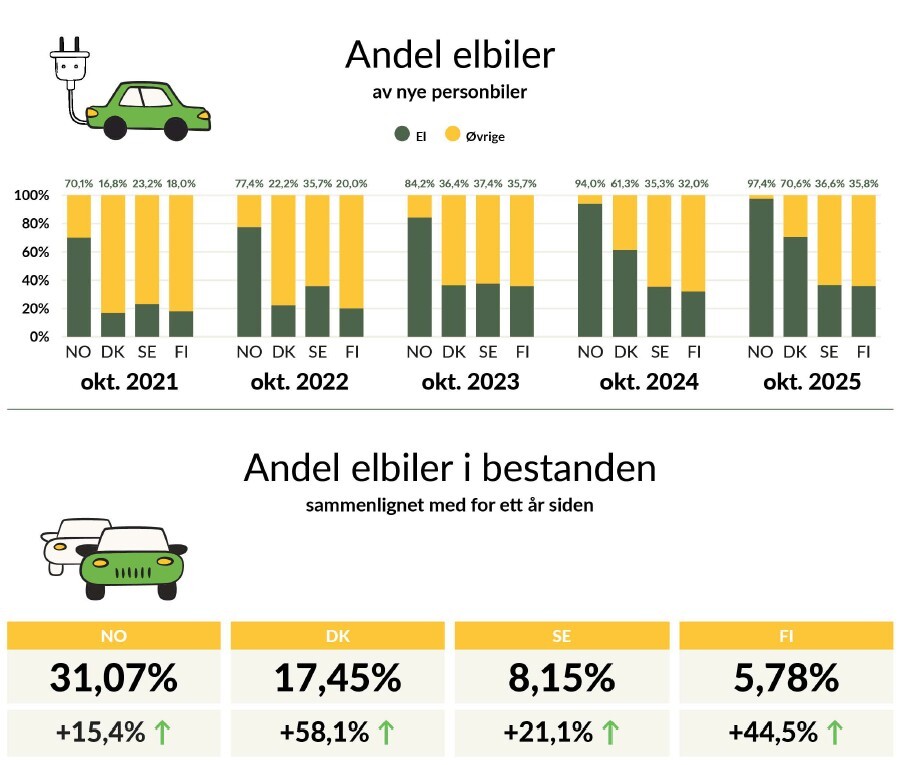 Elbilandelen i bilparkene vokser raskt i hele Norden. Norge ligger fortsatt klart i tet, med over 31 prosent elektrisk andel av bilparken. I Danmark har andelen økt kraftig det siste året til 17,5 prosent, mens Sverige og Finland følger etter med henholdsvis drøyt åtte og nær seks prosent.