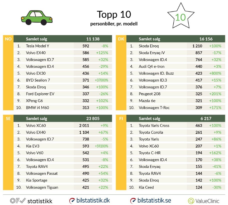 Norske data: OFV.no , Danske data: Bilstatistik.dk, Svenske data: Bilstatistik.se, Finske data: valueclinic.fi: Transport- og kommunikasjonsmyndigheten Traficom, Trafikk- og transportregisteret.