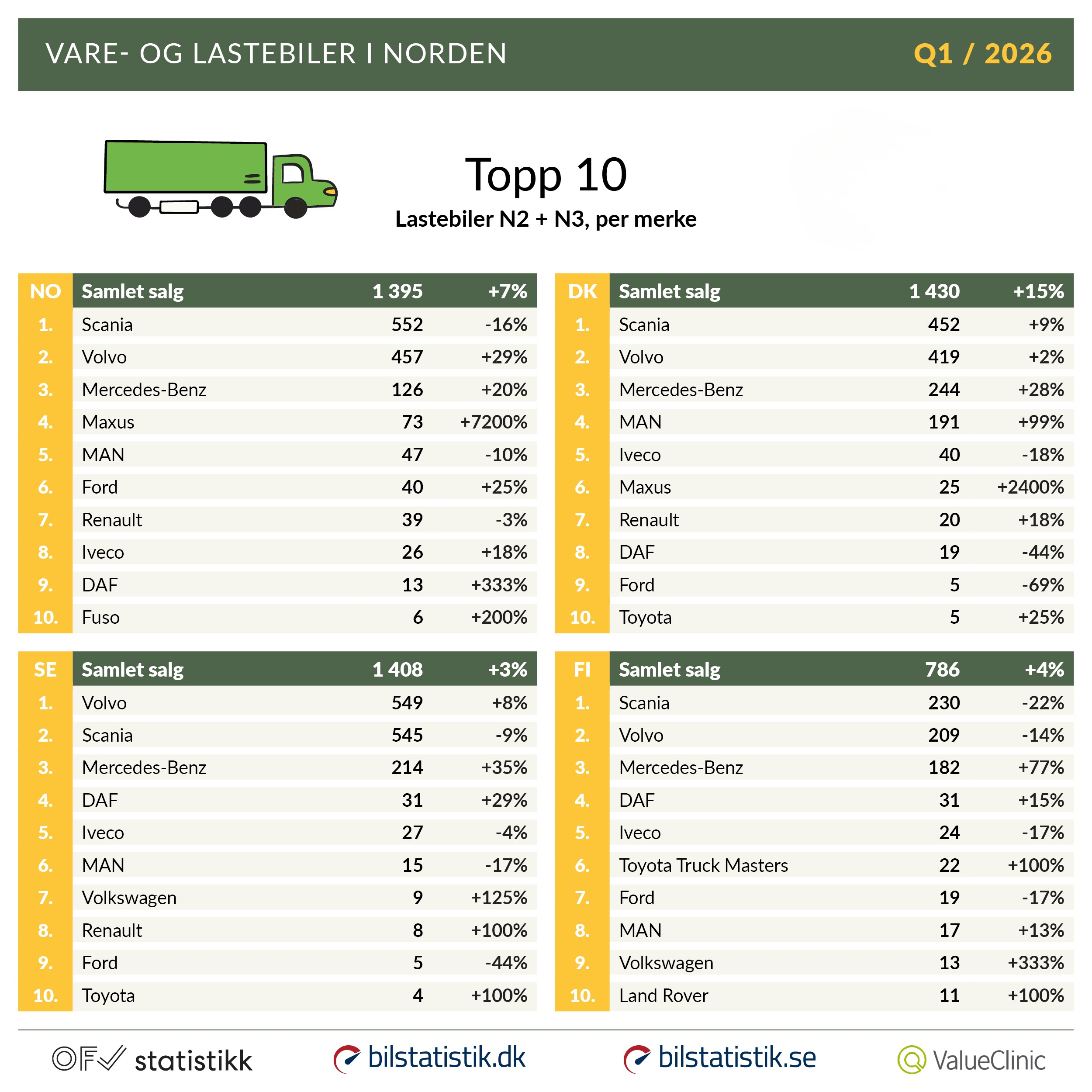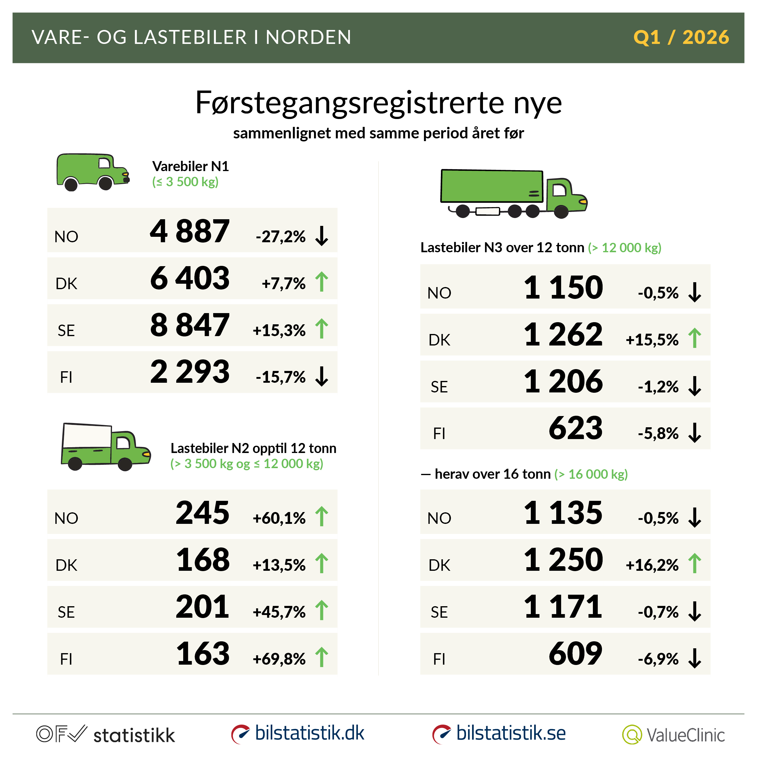 – Første kvartal 2026 viser at utviklingen i det nordiske markedet for vare- og lastebiler fortsatt varierer fra land til land. Tallene peker på et marked med store forskjeller både mellom de enkelte landene og mellom de ulike kjøretøysegmentene, sier Jonathan Schacht Halling Nielsen, visedirektør i Mobility Denmark.