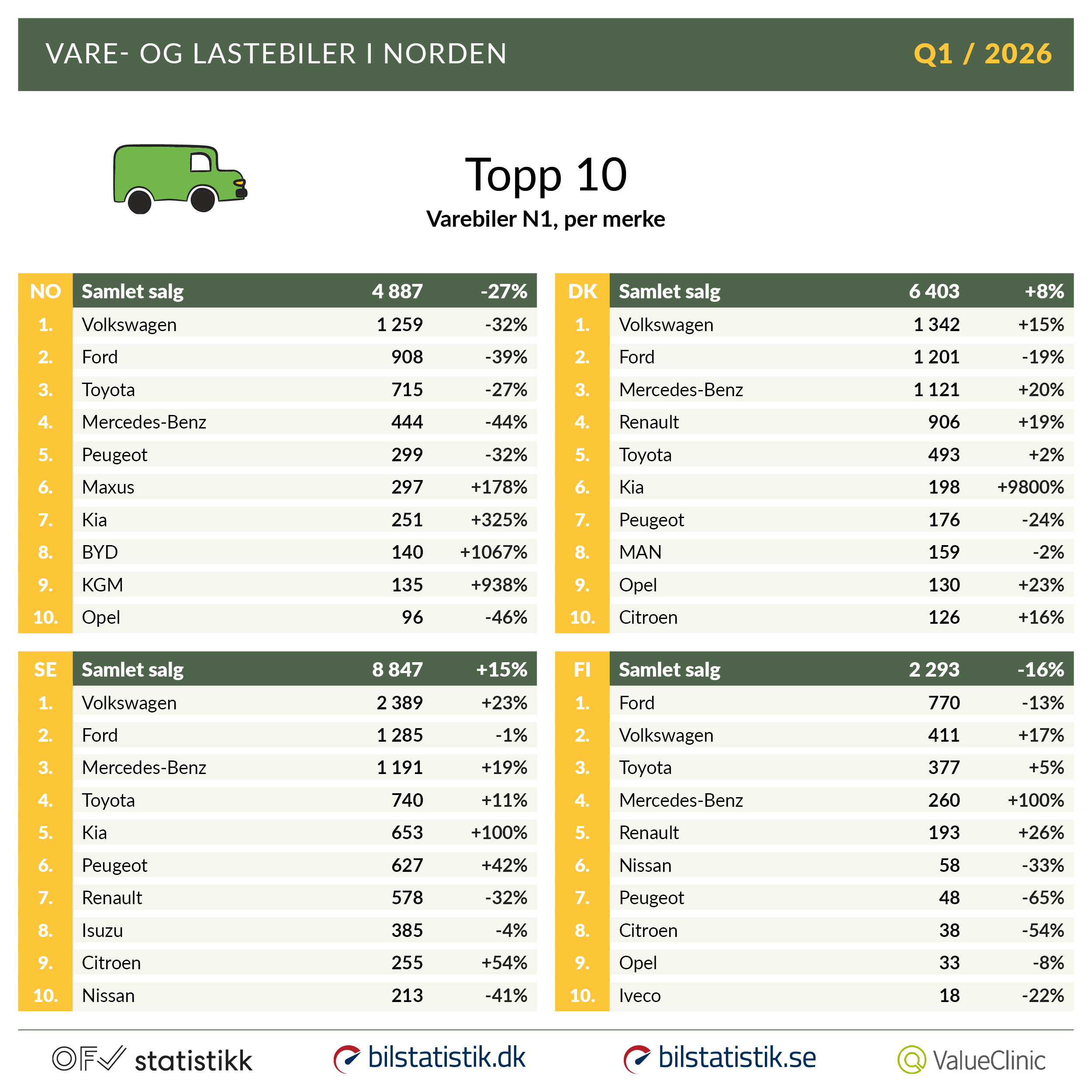 I Finland ble det registrert 2 293 nye varebiler i første kvartal, en nedgang på 15,7 prosent sammenlignet med samme periode i fjor. Diesel beholdt en sterk posisjon i varebilsegmentet, med om lag 75 prosent av registreringene, mens elektriske drivlinjer nå er det nest mest populære alternativet.