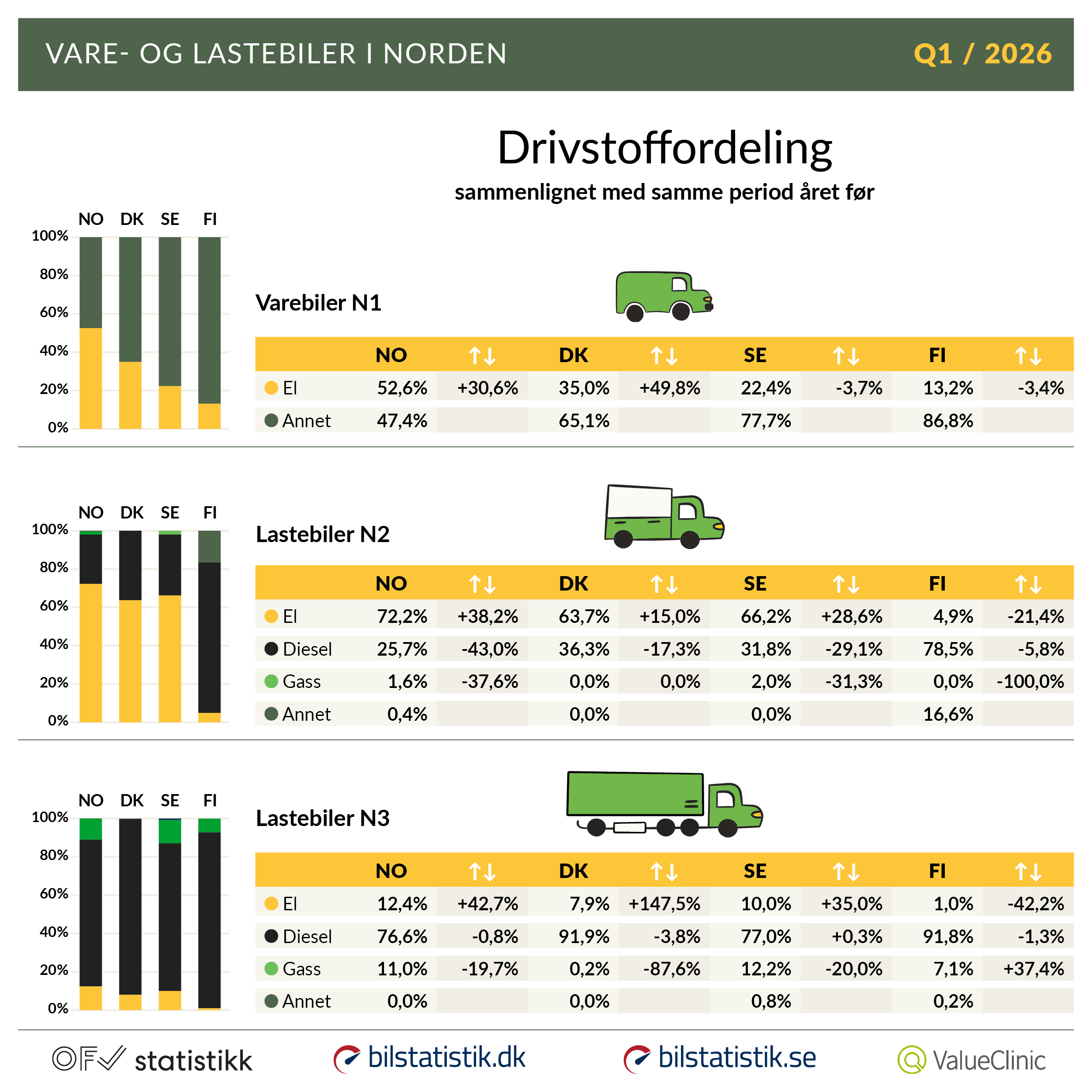 I Danmark ble det registrert 6 403 nye varebiler i første kvartal, en økning på 7,7 prosent sammenlignet med samme periode i fjor. Elbilandelen var 35,0 prosent. For lastebiler over 12 tonn var elandelen 7,9 prosent i første kvartal.