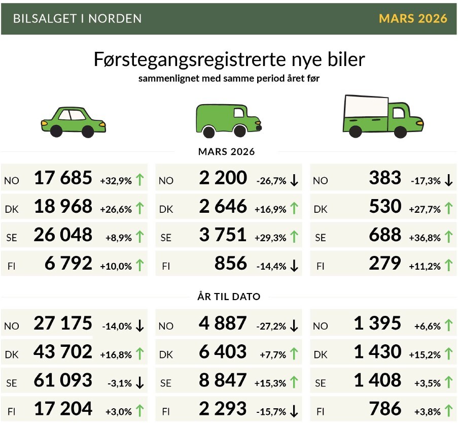 Mars ble måneden som samlet løftet det nordiske bilmarkedet. Etter en ujevn start på året, med store forskjeller mellom landene i januar og februar, ga mars vekst i personbilsalget i hele Norden og elbilen har også styrket sin posisjon gjennom hele første kvartal. I januar var utviklingen sprikende mellom landene, mens februar viste at 61,8 prosent av alle nye personbiler i Norden var elektriske. Første kvartal viser dermed et nordisk bilmarked som fortsatt utvikler seg ulikt, men der mars ga et tydelig felles løft.