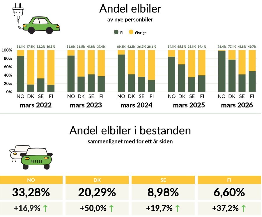 Norge satte ny rekord med 98,4 prosent elbilandel, Danmark holdt seg på et svært høyt nivå med 77 prosent, mens Sverige og Finland begge hadde elbilandeler på rundt halvparten. På modellsiden er det særlig Tesla Model Y som setter preg på Norden. Modellen topper salgslistene i Norge, Sverige og Finland, og er nummer to i Danmark i mars.