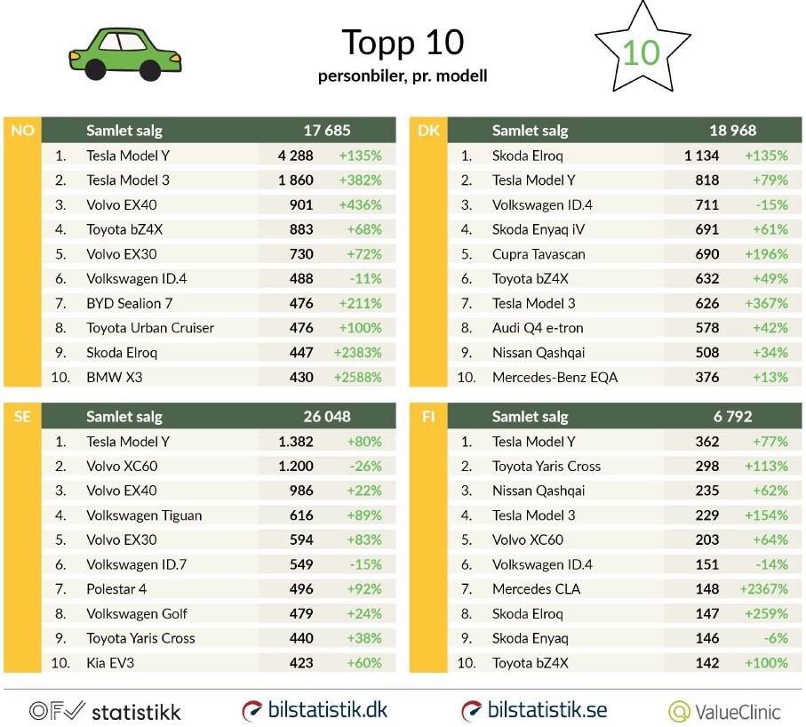 Norske data: OFV.no , Danske data: Bilstatistik.dk, Svenske data: Bilstatistik.se, Finske data: valueclinic.fi: Transport- og kommunikasjonsmyndigheten Traficom, Trafikk- og transportregisteret.